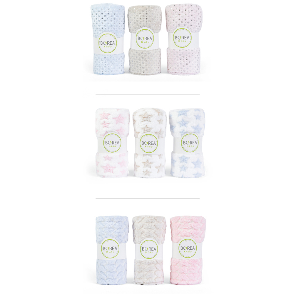 Εννέα κουβερτάκια αγκαλιάς από ύφασμα φλανελ, 100% πολυέστερ, σε 3 σχέδια και 3 χρώματα σε κουτί προώθησης.